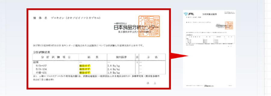 国内GMP工場での製造と放射能検査は実施済み。添加物も香料、人工甘味料は無添加で製造されている。