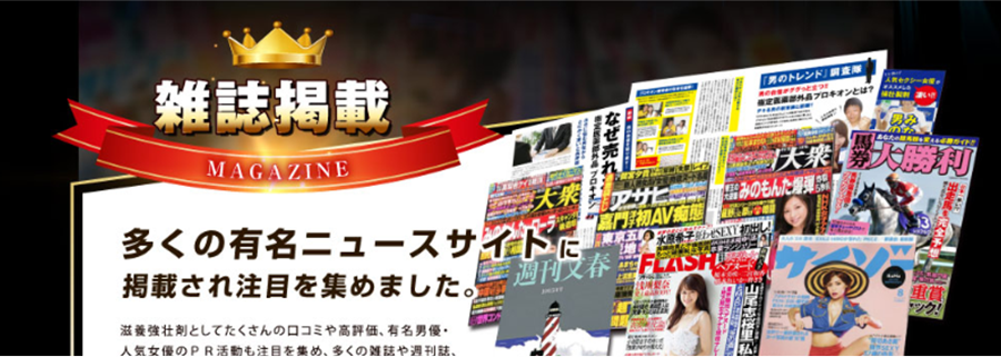 常にメンズサプリランキングにはランクインしてくる定番の人気商品。アルギニン量がマカの3倍が人気の秘密。GMP認定工場生産は当たり前の事、有機JASの認証も受けているのも高評価。成分がクラチャイダムのみなので実感できる人と全くできない人に極端に分かれてしまい、体に合わなかった人からは厳しい評価も。それでもリピート率は90%を超える安定感と累計60万箱突破の実績。今は降板しているが人気セクシー女優の明日花キララさんがイメージキャラを務めていたことでも有名。