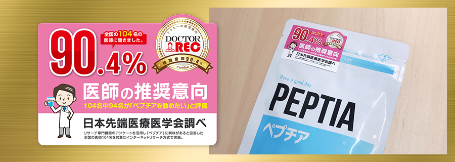 ペプチアは全国の医師総勢104名中94名が推奨され評価を得たサプリメント。さらに91%の医師が「使い続けたい」と評価するほど。その証拠にドクターRECマークを取得している。さらに4年連続でモンドセレクションを受賞するなど、品質に関しては業界トップといえる高信頼サプリ。