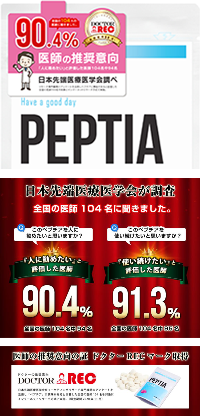 一般社団法人 日本先端医療医学会が行った調査では全国の医師104名中94名が「ペプチアを人に勧めたい」と回答し、「ペプチアを使い続けたいか?」という使用意向に関しても104名中95名と、実に91.3%の医師が『使い続けたい』と評価しています。